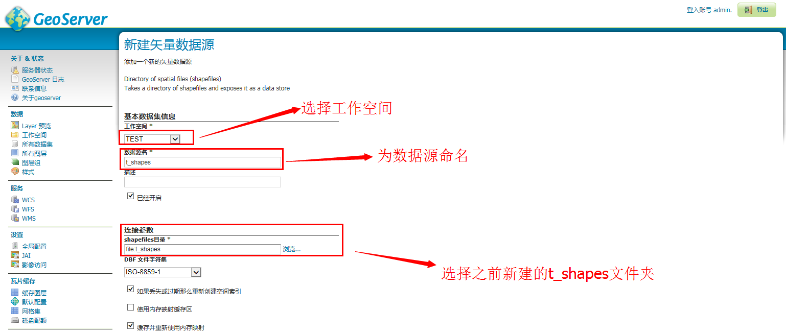点击“Directory of spatial files (shapefiles)”后,在出现的页面选择好工作空间,设置好数据源的名称,然后选择数据源的路径(图17)